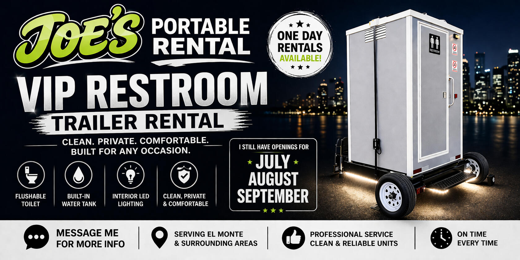 At Joe’s Portable Rental, we specialize in premium portable restroom trailers designed to elevate any event. Our units are thoroughly cleaned, sanitized, and professionally maintained to ensure the highest level of comfort and presentation. From delivery to setup, we handle every detail so you can focus on enjoying your event.
